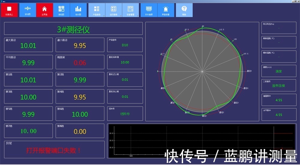 八轴测径仪作为一种光电检测装置,通过光电检测原理检测外径尺寸并计算出椭圆度尺寸,还可适用于螺纹钢的内径与肋高的检测。配备不同的测控软件,实现数据的汇总分析与图表绘制。